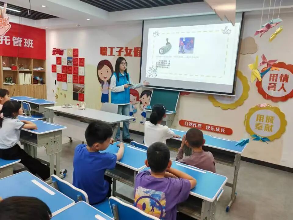 活动中,宣讲团的志愿者们从生活中的常见现象入手,引导孩子们思考背后的科学原理。比如,家中常用到的手电筒是如何发光的?演唱会上虚拟偶像的影像又是如何实现的?通过这些问题,志愿者们用简单易懂的语言为孩子们揭开了电磁感应和光学干涉的奥秘。